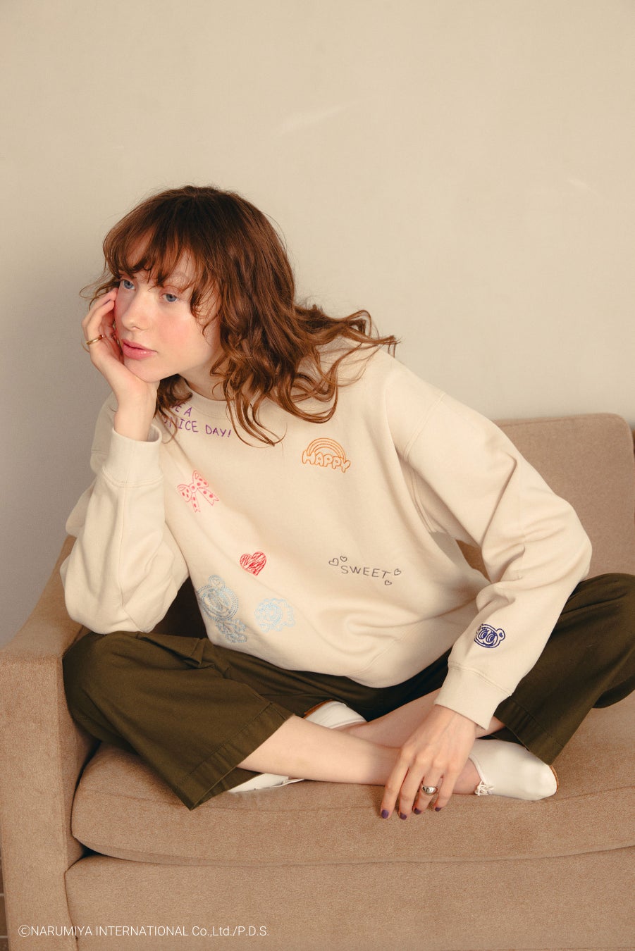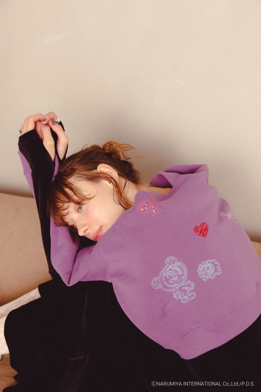 フロントやバックにも贅沢に刺繍が施され、袖口には人気キャラクター『ナカムラくん』がポイントに。やわらかい裏起毛素材で、少し短めの着丈でトレンドライクなシルエットに。