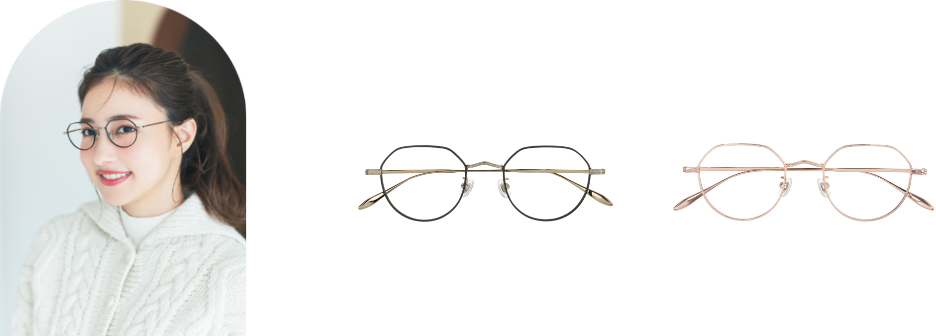 「私が普段から愛用しているメガネからインスピレーションを受けて作ったお気に入りの1本。フレーム下の丸みを帯びたカーブが顔によく馴染んで、顔の印象までかわいらしくなる気がします。アクセサリーのようなメタルのつるの先や、柔らかな印象のピンクゴールドがポイントです。」