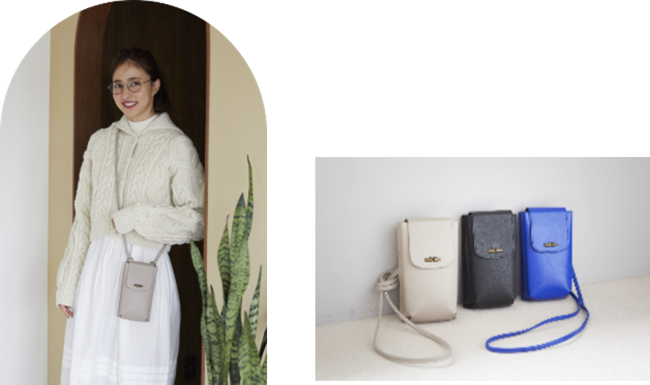 さらに、スマートフォンやメガネもコンパクトに持ち運べるオリジナルのショルダーバッグをブラック、グレージュ、ブルーの1型3色展開で発売です。