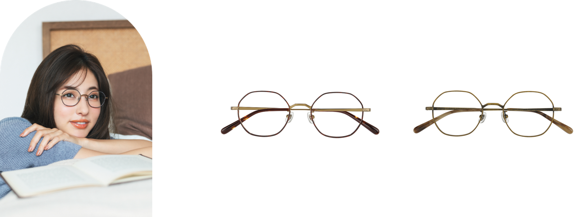 「ディテールにまでこだわった多角形のフレームは、実は肌なじみが良い型。シックな印象になるようにアンティークゴールドを選んだのもこだわりです。フロントがべっ甲柄になっていて、顔の角度によって色のニュアンスが変わるところもお気に入り。」