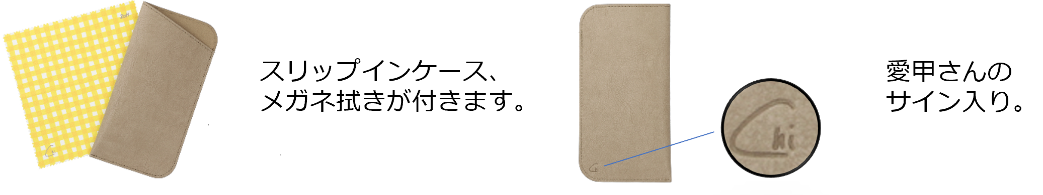 付属のメガネ拭き素材の巾着にメガネを入れて、他にもリップなども入るサイズ感。裏面にはスマートフォンが収納できるポケット付きで、ちょっとしたお出かけに嬉しいバッグです。背面に愛甲さんのサインの型押しが入った、全3色展開の特別アイテム。
