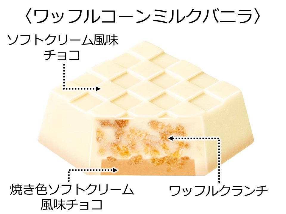ソフトクリーム風味のチョコと香ばしい焼き色チョコの間に、ザクザク食感のワッフルクランチを閉じ込めました。ザクザク食感が楽しめます。