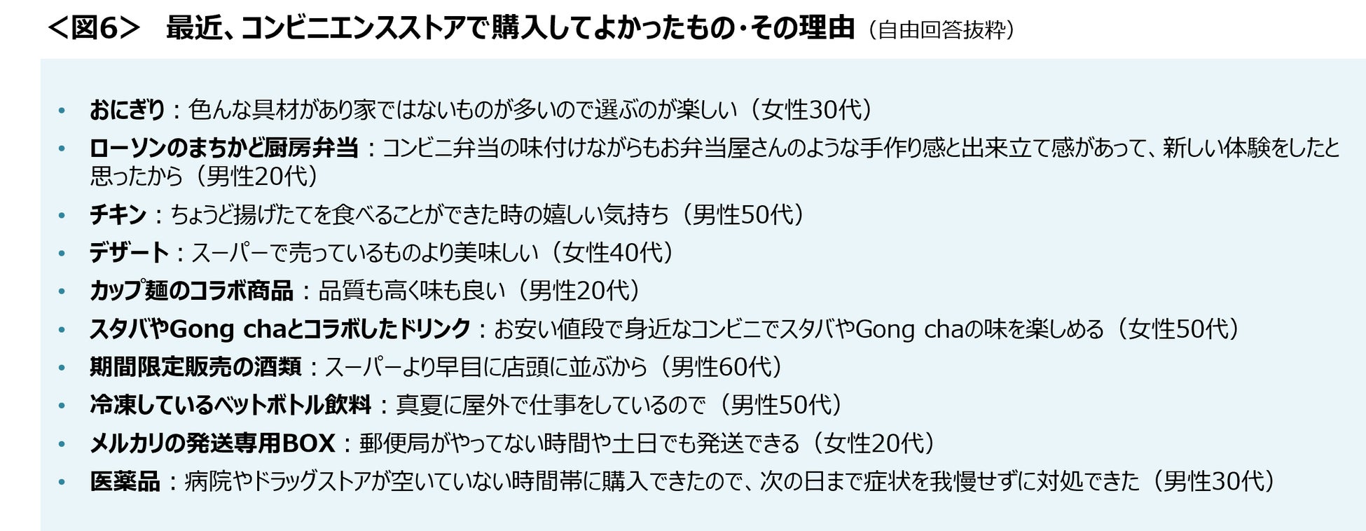 最近、コンビニエンスストアで購入してよかったものは、コンビニエンスストア限定で販売している食品が多くあげられた。<図6>