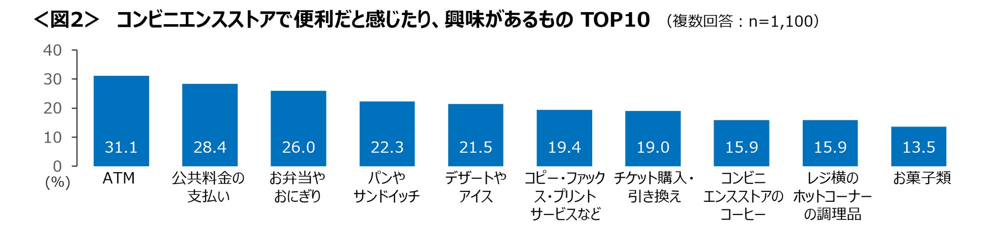 コンビニエンスストアで便利だと感じたり、興味があるものは、「ATM」「公共料金の支払い」「弁当やおにぎりがTOP3。<図2>