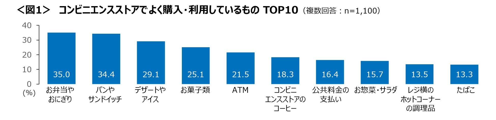 コンビニエンスストアでよく購入しているものは、「お弁当やおにぎり」「パンやサンドイッチ」「デザートやアイス」「お菓子類」といった食品が上位。<図1>