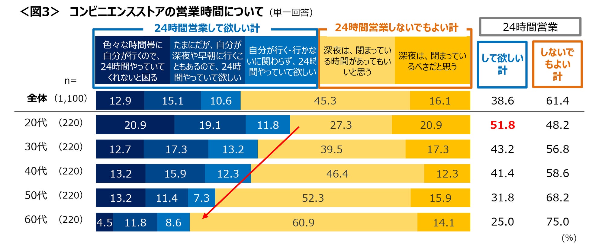 「24時間営業をしてほしい」は20代で過半数を占めるが、年代が高いほど低く、60代では25.0%に留まる。<図3>