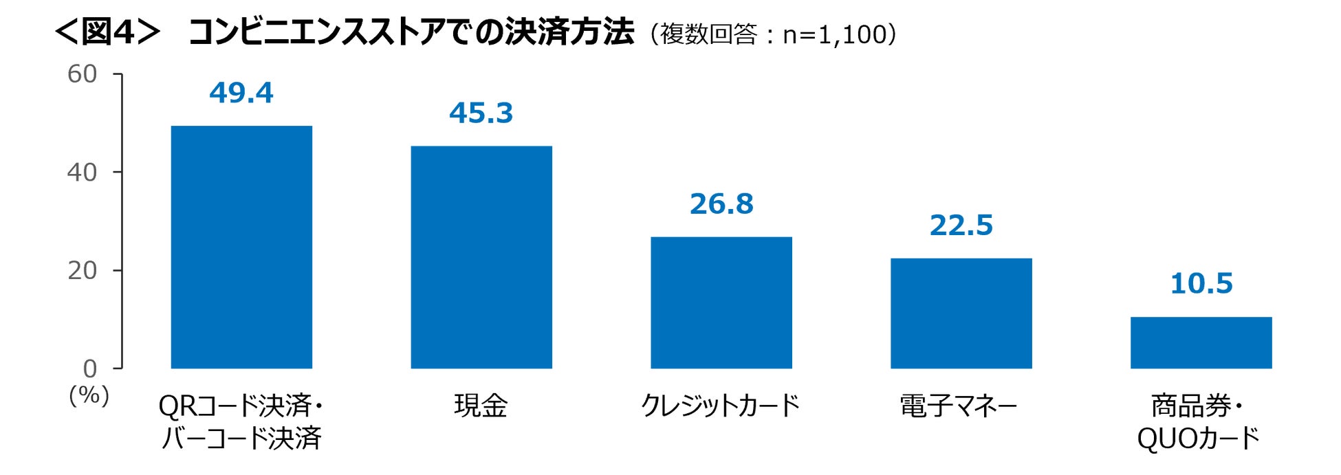 コンビニエンスストアでの支払いは、「QRコード決済・バーコード決済」が49.5%、次いで「現金」が45.3%と2強。<図4>