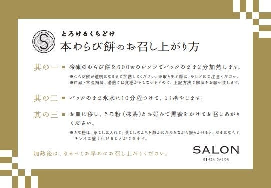 SALON GINZA SABOUの店内メニュー『とろけるくちどけ本わらび餅』がこの度、ご自宅でもお楽しみいただける冷凍パッケージになって販売スタートいたします。