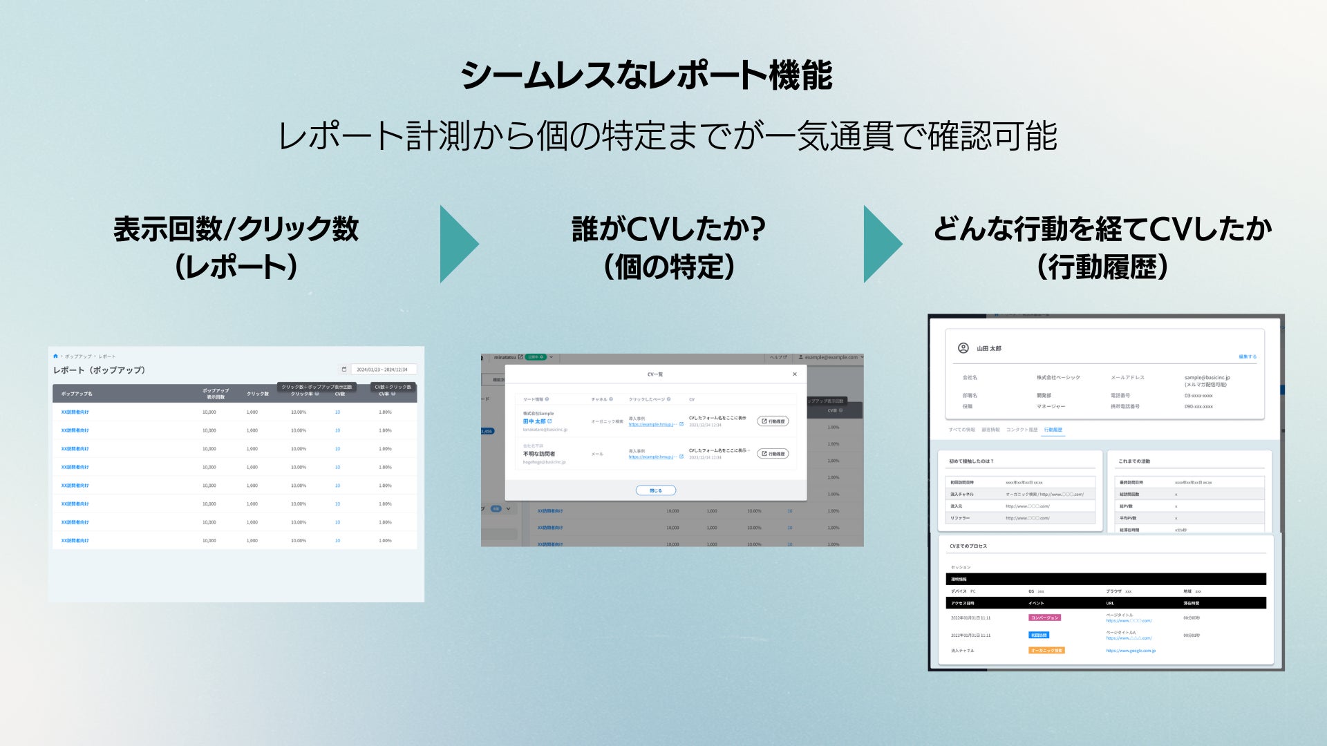 ポップアップの表示回数やクリック数、CVしたユーザーの行動履歴まで、一つのツール内で流れるように確認可能。マーケティング施策の振り返りをスムーズに行い、効率的にPDCAを回せます。