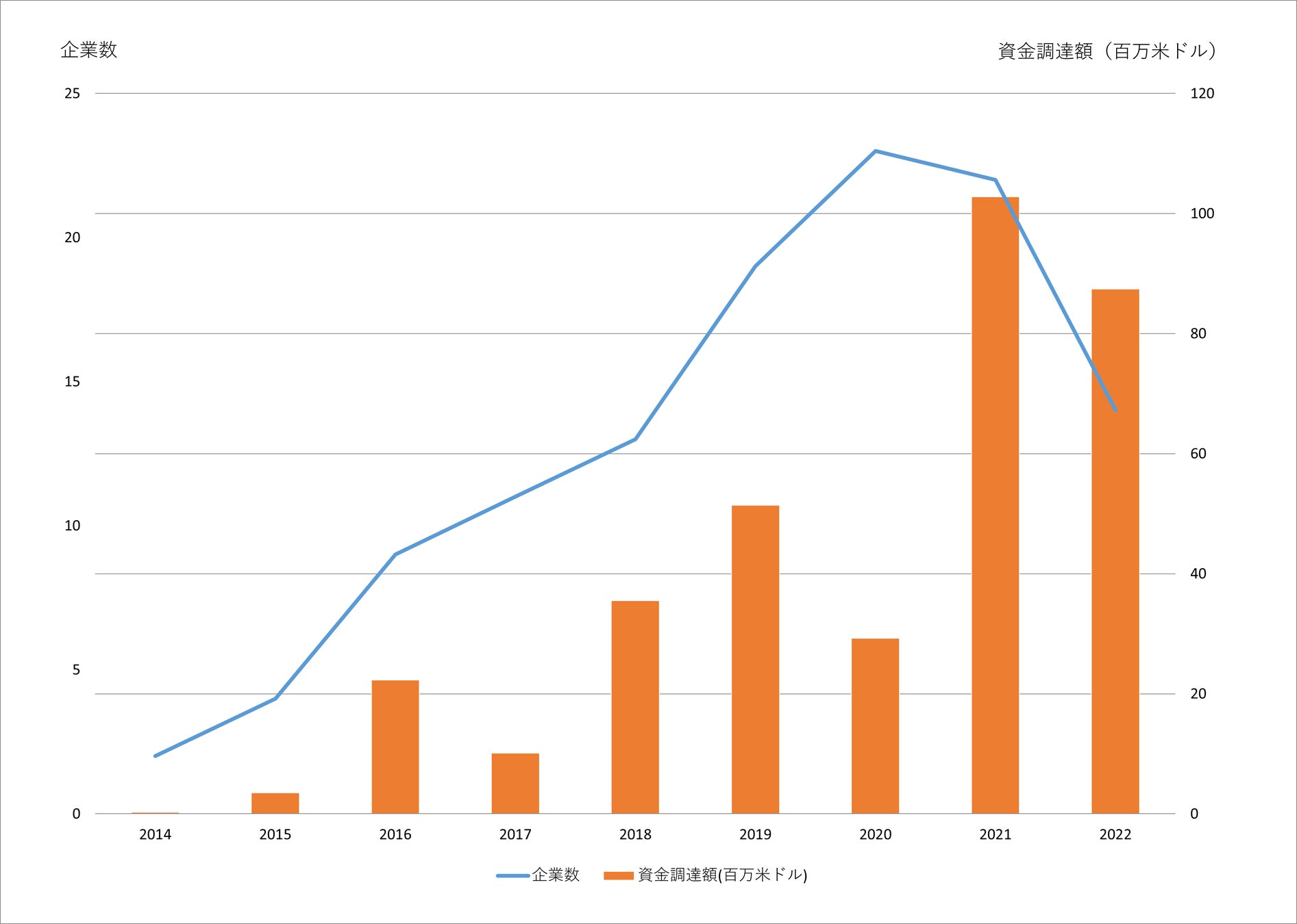 次に、スタートアップ企業の全体数と資金調達額の現状を確認します。図2は、各年で資金調達のあったスタートアップ企業の件数と調達額の推移です。