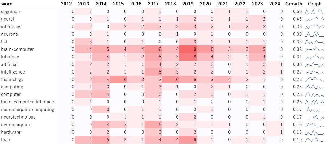 ここでの成長率(Growth)は各年の文献内における出現回数と、直近6年間(2019~2024年)での出現回数の割合で表し、数値が1に近いほど直近で出現している頻度が高いとみなせます。出現回数の割合が顕著に増加傾向にある語は「brain-computer」や「interface」で、脳とコンピュータをつなぐ「Brain-Computer Interface(BCI)」への注目の高まりが現れています。これには、人間の脳から直接測定した信号を積極的に活用し、AIや医療用ロボットへ展開させていきたいという社会のニーズによるものと推測されます。その一方、全体の成長率は値が0.5以下であり、スタートアップ企業において出現が伸びている語は見られないことがわかります。