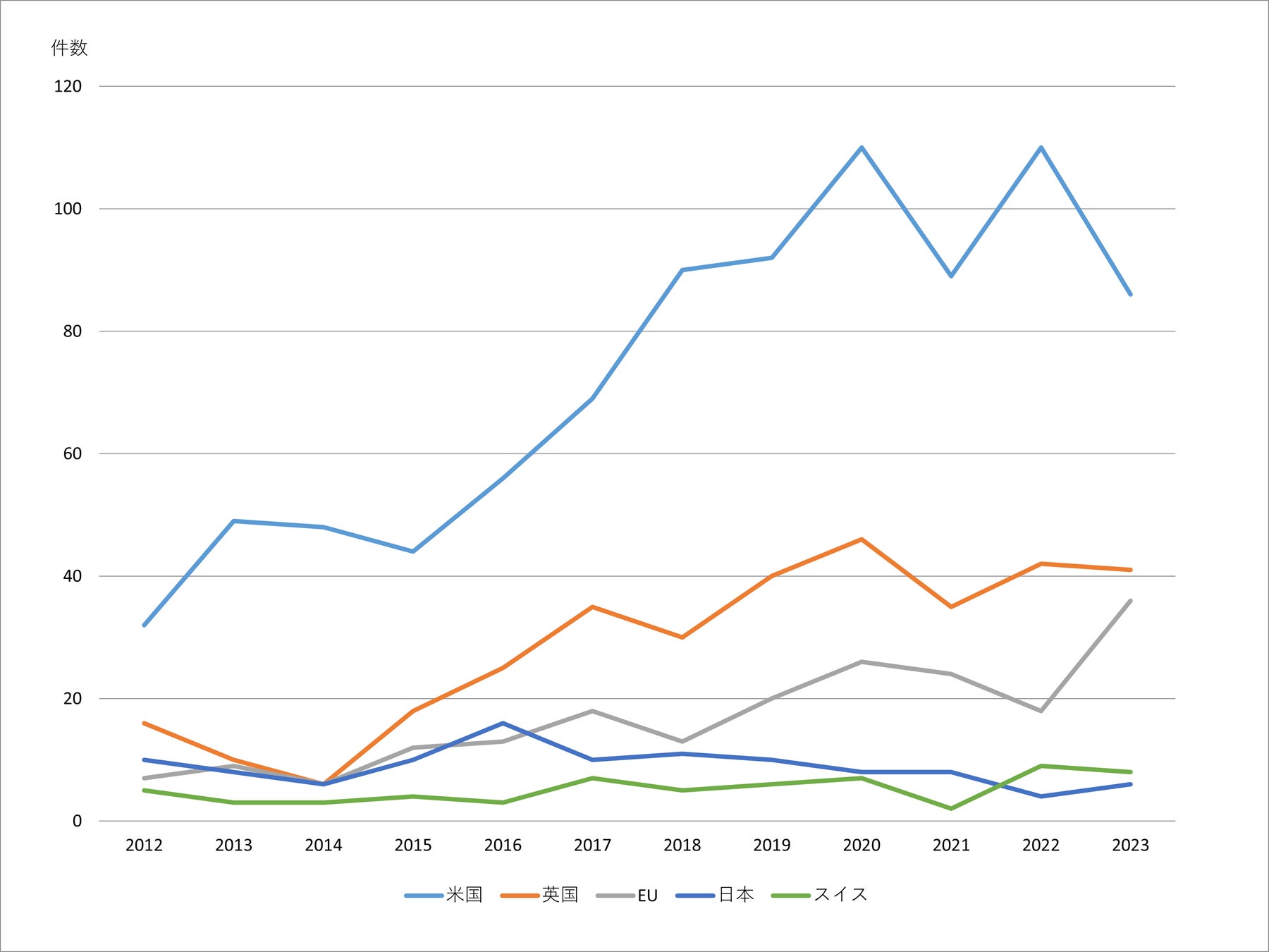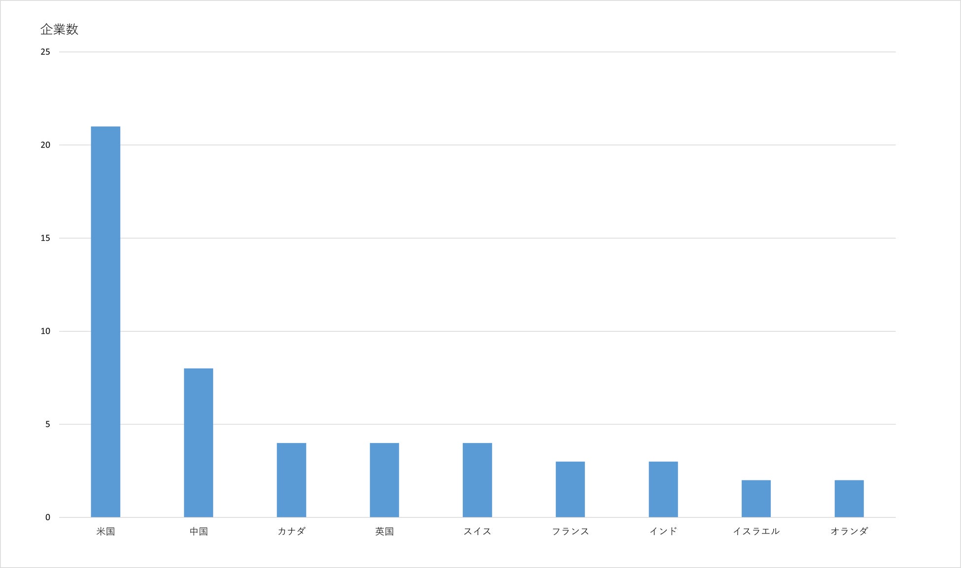 図3には2014年から2022年における国別でのスタートアップ企業の件数を示します。国別では米国が圧倒的に多く、その次に中国、カナダ、英国、スイスが続く形となっています。日本はまだ1社しかなく、今後増加することが期待されます。