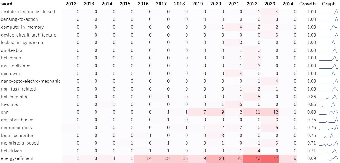 図4に2012年から2024年までの脳型コンピューティング技術に関するグラントに含まれているキーワードの年次推移を示します。