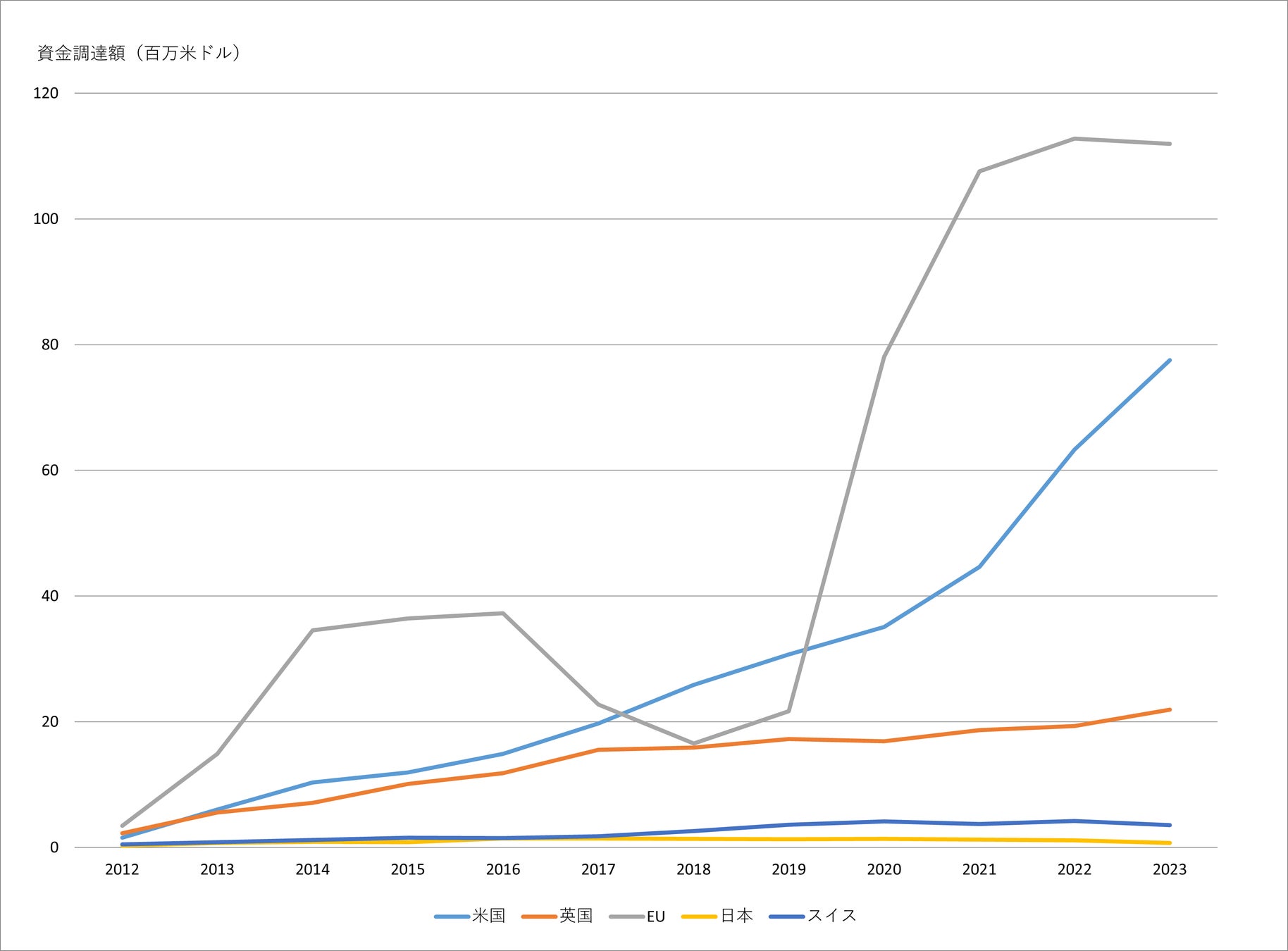資金調達額は増減を繰り返していますが、中長期的には上昇トレンドにあります。変動を繰り返しながら今後も成長する可能性が高いでしょう。一方、調達のあった企業の件数については増加の傾向が見られていたものの、2022年に大きく減少しました。これは、大きな割合を占める米国や欧州の景気や投資傾向の変化を反映していると見られます。