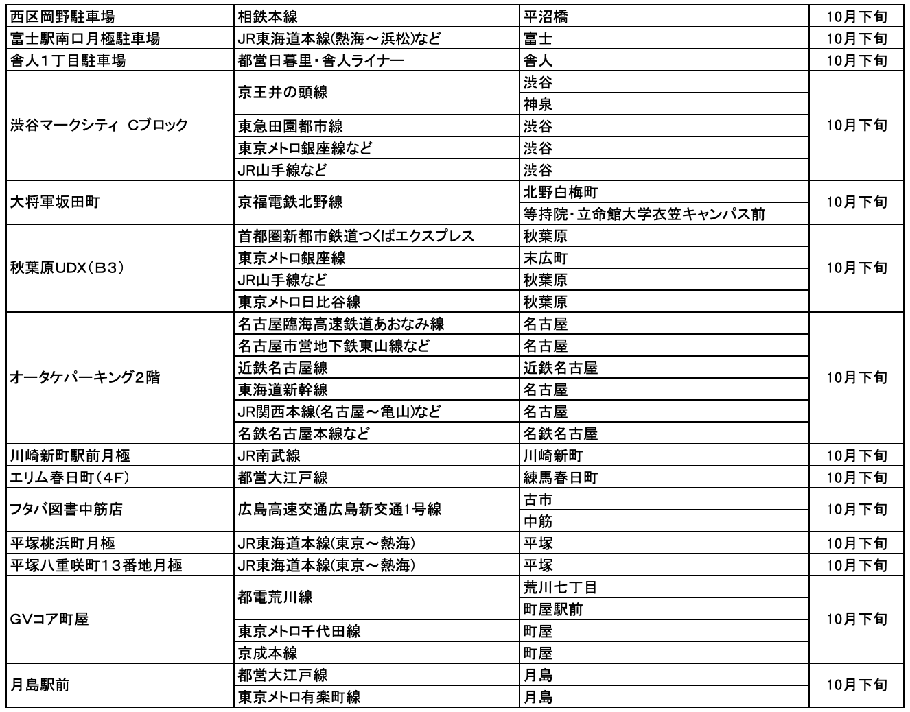 10月にオープンおよびオープン予定の「パーク&ライド」が可能な駐車場は2件、「レール&カーシェア」が可能なステーションは44件です。