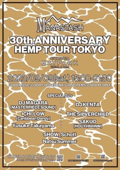 株式会社TSIホールディングス(本社:東京都港区赤坂、代表取締役社長:下地 毅)のグループ会社である株式会社TSIが運営する、1993年創業のアメリカ、シアトル発祥のアメリカンライフスタイルブランド「MANASTASH」は、2023年9月9日(土) 豊洲・CITABRIA BAYPARKにて”MANASTASH創業30周年”を記念したイベント「30th ANNIVERSARY HEMP TOUR TOKYO」を開催いたします。