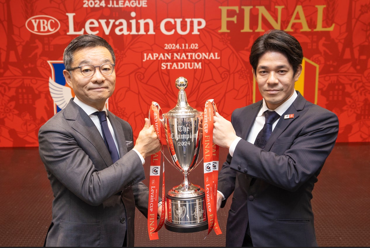 トロフィー先端のサッカーボール モチーフがデザイン アクセントとなったスターリング シルバー製のトロフィーは、高さ約56cmを誇り圧倒的な存在感を放っています。トロフィー表面には“The Champion 2024”の文字が刻まれ、エボニーウッドの台座に付いたシルバープレートには大会名でもある“J. League”と“YBC Levain Cup”の文字が刻まれています。