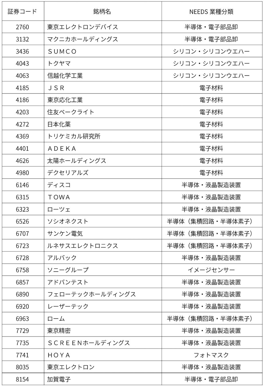 - 日経NEEDS業種分類で半導体関連業種に属している銘柄