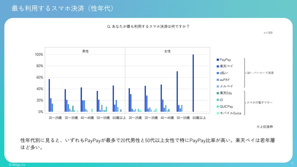 ・性年代別では20代男性と50代以上女性で特にPayPay比率が高く、楽天ペイは若年層ほど多かった