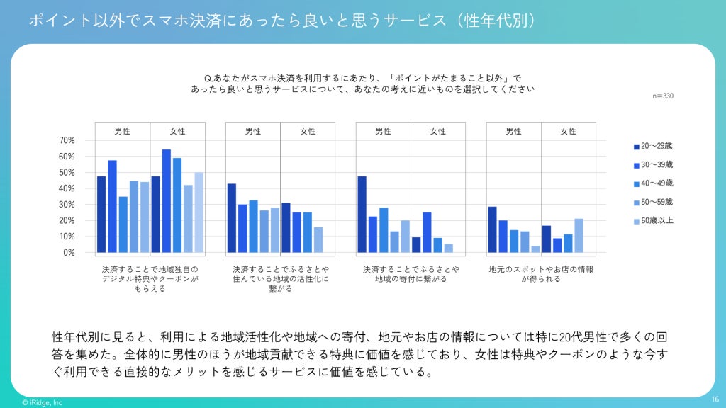 ・全体的に男性のほうが決済の先にある地域との繋がりなど+αのサービスへの関心が高く、女性は地域貢献などの抽象的な価値より、今すぐ利用できる直接的なメリットを求めている様子がうかがえる
