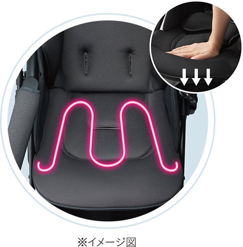 衝撃吸収材「Gブロック」を内蔵したヘッドパッドが、赤ちゃんの頭部に伝わる衝撃を軽減。頭にフィットする独自の形状が振動による頭の左右の揺れを抑え、ほど良い高さで首を無理なく支える。