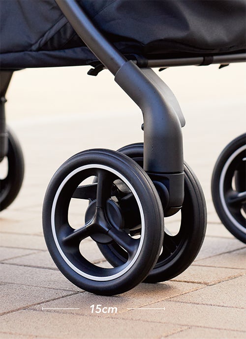 地面との設置点が多く安定性のある15cmの大径ダブルタイヤで、段差の乗り越えやすさをサポート。斜面や悪路でも安定して押すことができる。