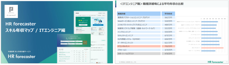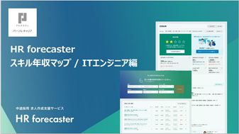 「保存版ハンドブック スキル年収マップ」は、転職サービス「doda」の100万件以上の転職統計データを活用した「HR forecaster」を用いて算出・作成しています。1つの職種でスキルに応じた「職種×スキル」の平均年収を算出し、採用担当者は自社が求めるスキルを持つ人材の適正な年収を一目で把握することが可能となります。