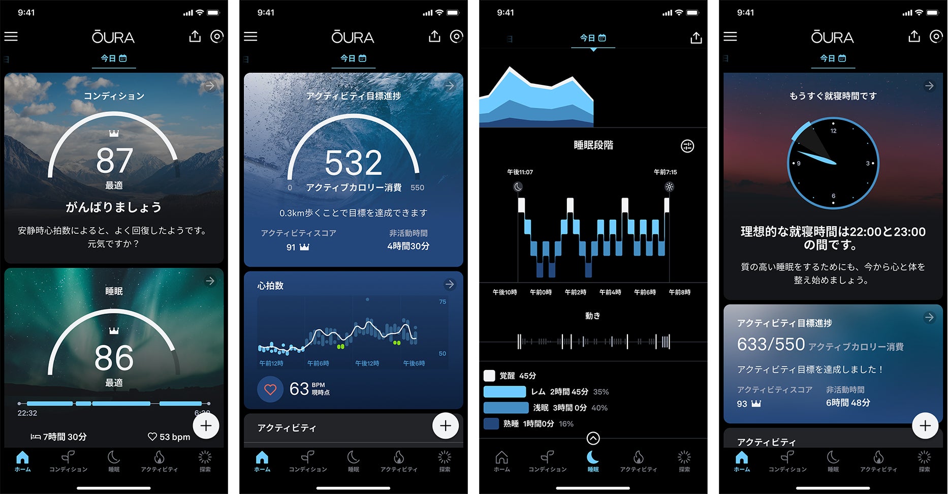 日本語に対応した専用アプリに、達成したい目標や現在の睡眠状態、睡眠に影響を与えている生活事情、そして個人情報(生年月日・体重・身長・性別)を初期設定時に選択・登録することで、アプリをパーソナライズすることができます。リングに搭載されている高度なセンサーにより計測されたデータに基づき、目標の達成度や心身の疲労回復度合いなどを、アプリで確認することができます。また、継続使用することで、分析能力が向上し、よりパーソナライズした健康状態の把握と改善に役立てることができます。