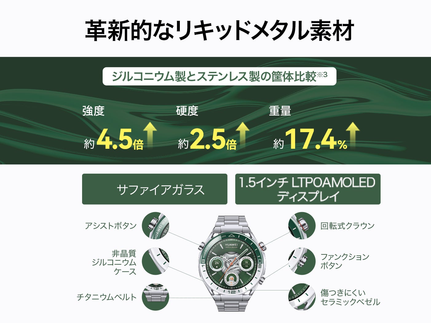 ※3:ファーウェイラボのテスト結果に基づきます。ファーウェイの時計に採用されているジルコニウムベースのリキッドメタルケースとステンレススチール316L ケースの比較です。