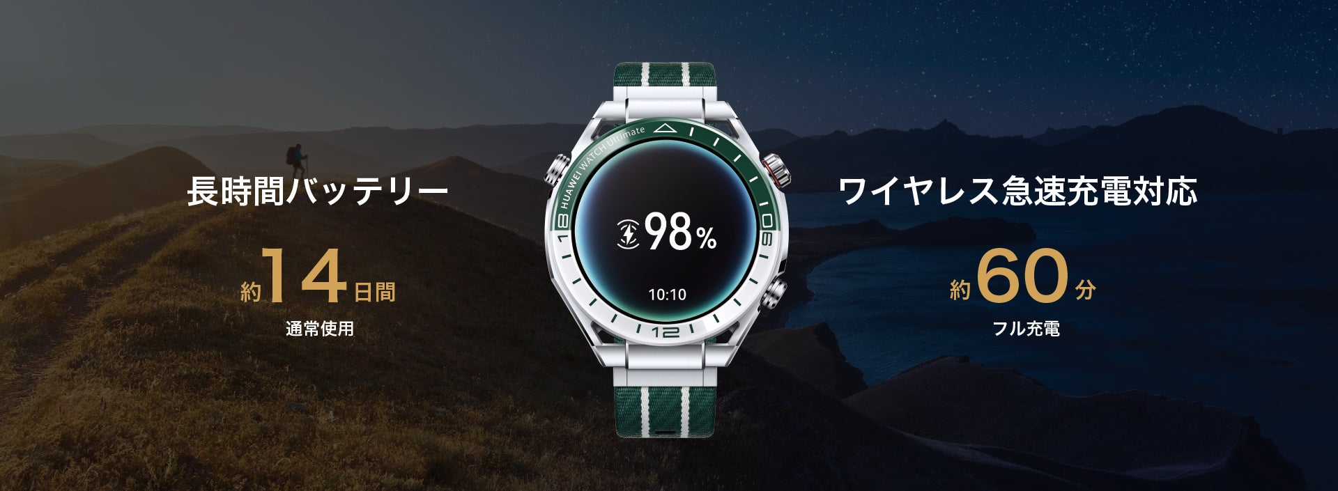 新搭載のゴルフ機能のほか、水深約100mまでダイビング可能な防水テクノロジー、位置情報を含めた100時間以上の連続ワークアウト記録が可能なエクスペディションモード、24時間モニタリングする健康管理※1、通常使用※2で約14日間持続するロングバッテリーなど、ファーウェイが持つテクノロジーを集結させたプレミアムな1台となっております。