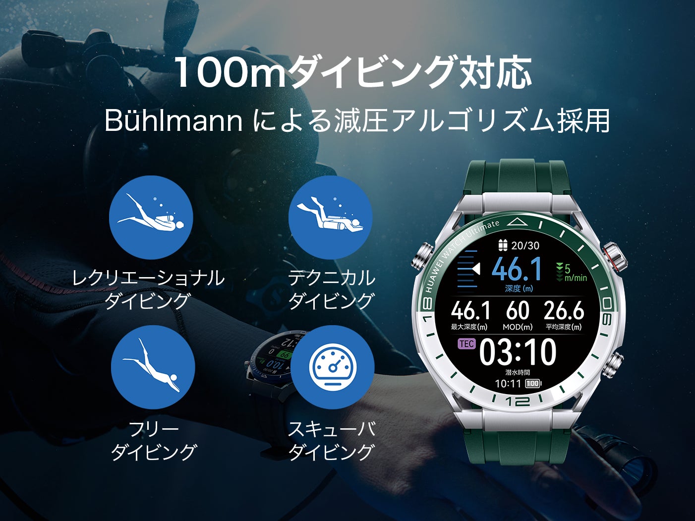 100mのスキューバダイビングモード※4を提供するスマートウォッチで、プロレベルの様々なダイビングアルゴリズムとダイビングガイドを備えています。Bühlmannによる減圧アルゴリズムを用いて、ダイビングデータを継続的にモニタリングし、リアルタイムの環境に応じた提案を行うため、集中力を切らさずに深い青の世界に没入することができます。