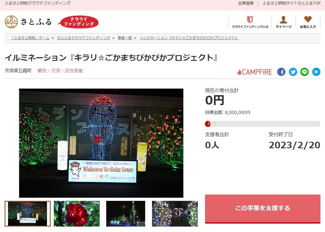 茨城県五霞町とふるさと納税ポータルサイト「さとふる」(https://www.satofull.jp/)を運営する株式会社さとふる(本社:東京都中央区、代表取締役社長:藤井 宏明)は、寄付金の使途に応じて事業を立ち上げ寄付を募る「さとふるクラウドファンディング」(https://www.satofull.jp/projects/top.php)にて、昨年初めて開催した「道の駅ごか」でのイルミネーション企画を今年も継続実施し、観光スポットとしての定着を目指すため、2022年11月25日(金)より2023年度の事業費の寄付受け付けを開始します。