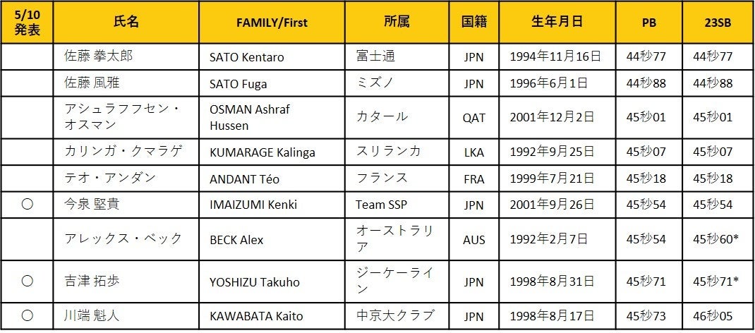 【セイコーGGP】200m・400m・走幅跳出場選手追加発表:パリ五輪 4×400mリレー出場権を獲得した4名が参戦!