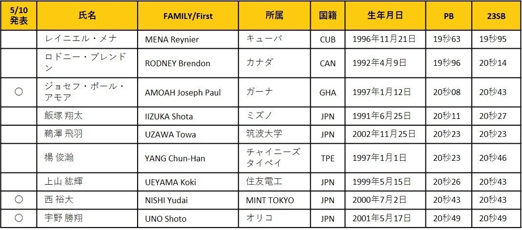 男子200mにはナッソー2024世界リレー男子4×400mリレーでパリ2024オリンピック出場権を獲得した西裕大( MINT TOKYO)、杭州2022アジア競技大会8位入賞の宇野勝翔(オリコ)の出場が新たに決定しました。