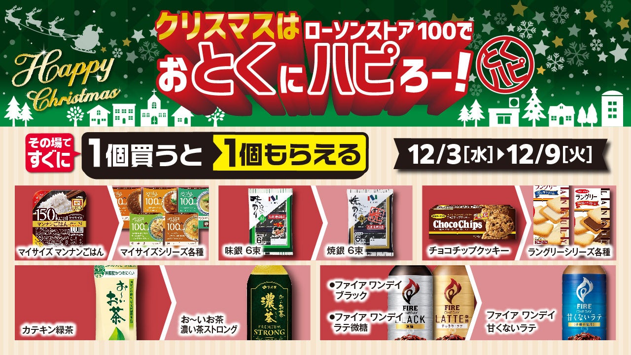株式会社ローソンストア100(神奈川県川崎市)は、親会社である株式会社ローソン(東京都品川区)の展開する「ハッピー・ローソン・プロジェクト!」(『ハピろー!』 )と連動し、特別企画「おとくにハピろー!」(『とくハピ』)を開催。2025年12月3日(水)から12月25日(木)の期間、「ローソンストア100」(611店舗/2025年10月末現在)の店舗にて、クリスマスに向けて“お得にハッピーに”お買い物いただけるキャンペーン「クリスマスはローソンストア100でおとくにハピろー!」を実施いたします。