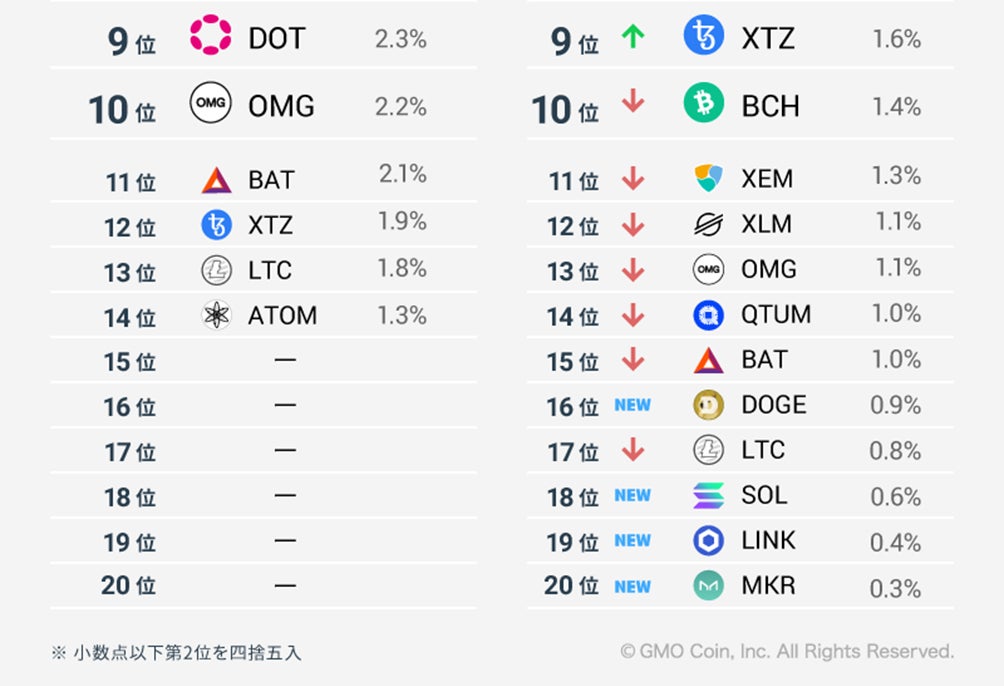 前年2021年のランキングと比較すると、イーサリアム(ETH)がリップル(XRP)を抜いて2位となりました。また国内ではGMOコインが唯一取り扱っているコスモス(ATOM)(※2)のシェアが約5%上がり、4位にランクインしました(※3)。