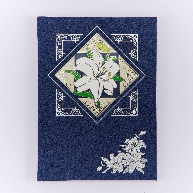 本商品は、銀色の箔押しが美しい高級感のある台紙に、清らかな一輪の百合が印象的な電報台紙です。