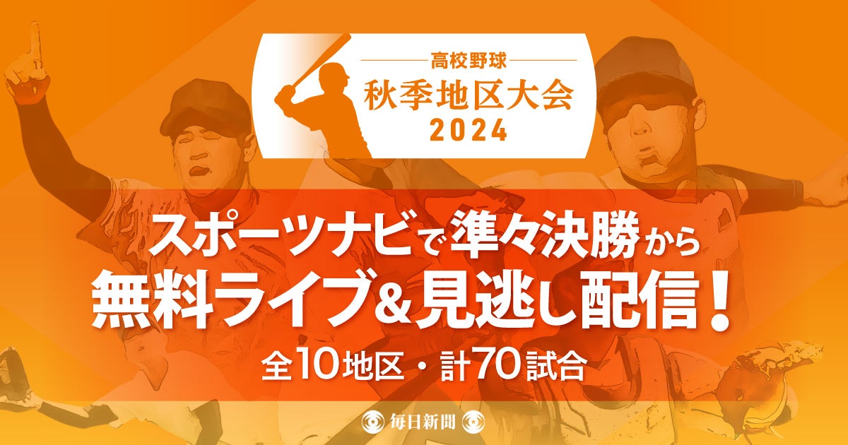 毎日新聞社は、北海道から九州まで全国10地区で争われる秋季高校野球地区大会で、準々決勝以上の合計70試合を、LINEヤフー株式会社が運営するスポーツ総合サイト「スポーツナビ」(https://baseball.yahoo.co.jp/hsb)で無料ライブ配信します。試合後にはダイジェストや見逃し動画も配信。来春のセンバツ出場校選考の重要な参考資料となる秋季地区大会の熱戦を、スマホやタブレット端末、PCでお楽しみください。
