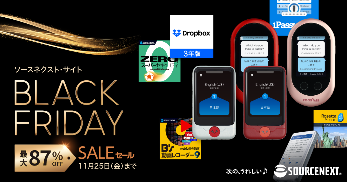 ソースネクスト株式会社(本社:東京都港区、代表取締役社長:小嶋 智彰)は、11月17日(木)から11月25日(金)までの9日間、弊社サイト上で「BLACK FRIDAY SALE」を開催いたします。