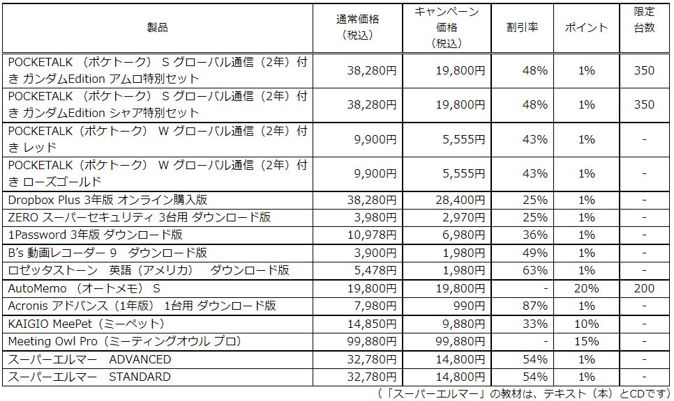 本セールでは、AI通訳機「ポケトークⓇ S」のガンダムEditionを48%割引に、AIボイスレコーダー「オートメモS」を20%ポイントバックなどIoT製品のほか、ストレージサービス「Dropbox Plus 3年版」、セキュリティソフト「ZERO スーパーセキュリティ」を25%割引など、全15製品を最大87%割引の特別価格で提供します。