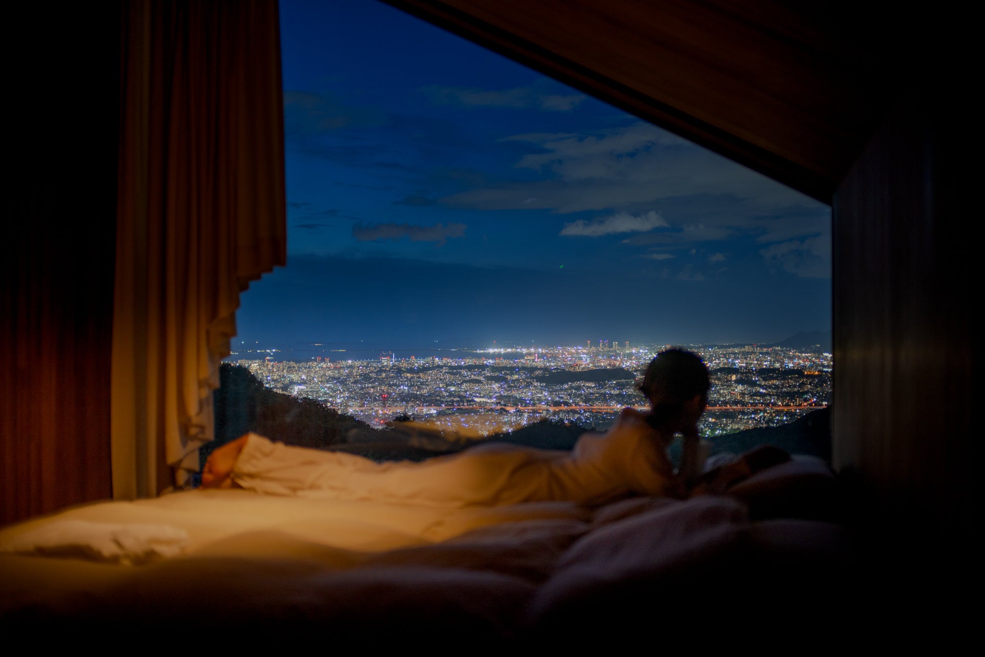 空気の 澄ん だ油山の冬の夜空には 満天の星と美しい夜景が広がります。焚火の温もり を感じながら、