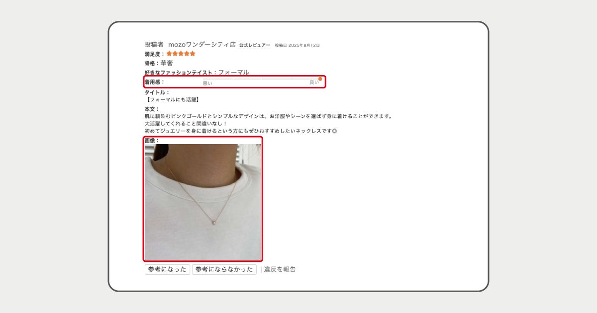 ジュエリー選びで重要な要素となる「着用感」を、「良い」から「悪い」の5段階でグラフ表示することで、視覚的にも分かりやすくレビュー情報を確認できるようになりました。