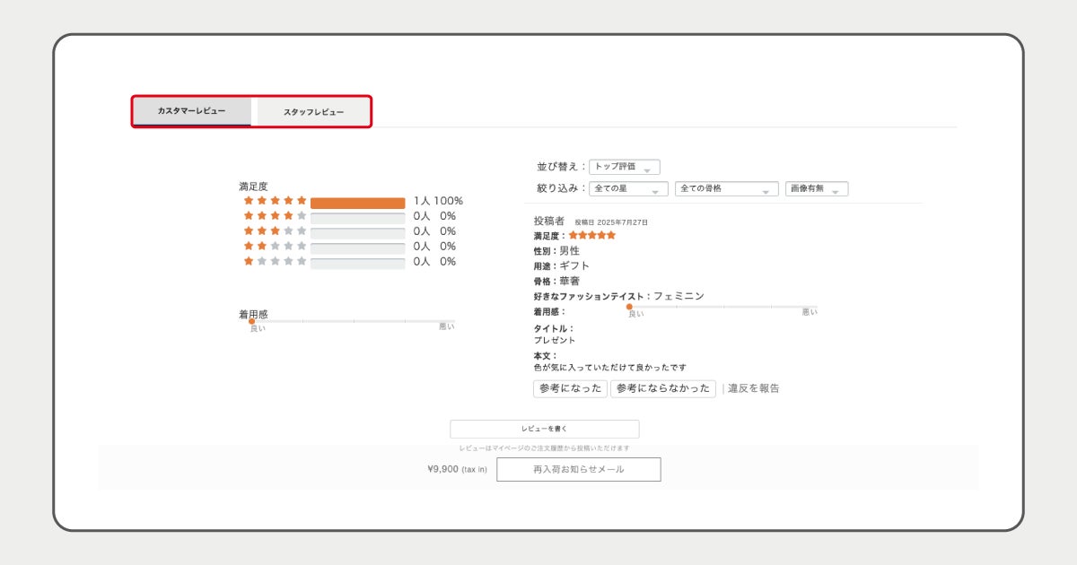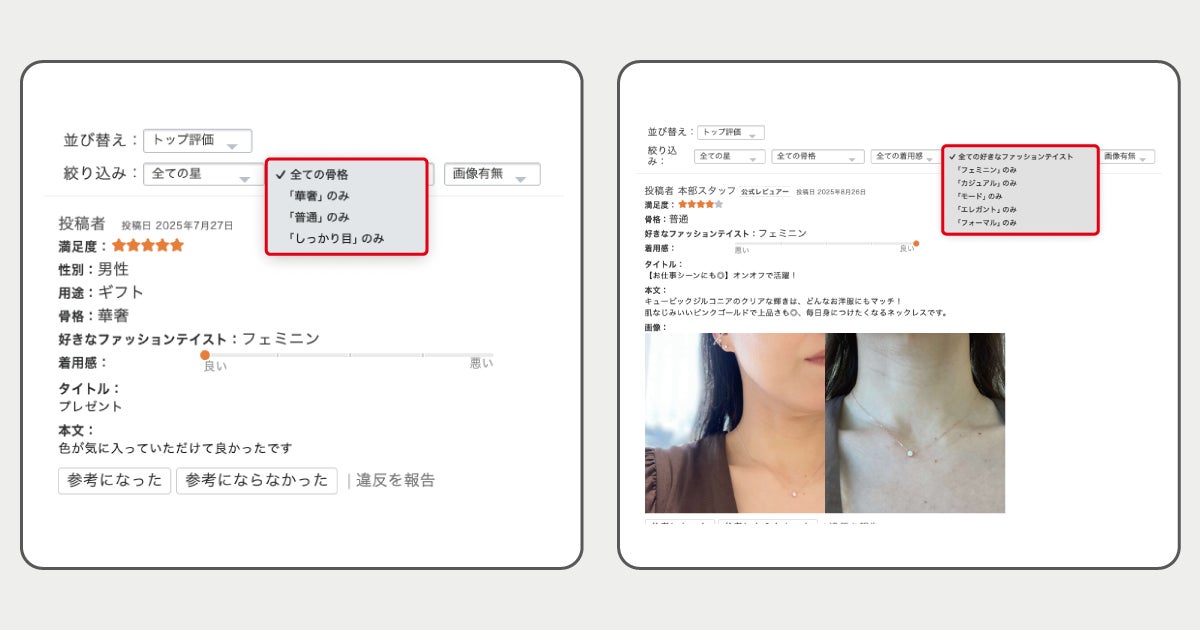 商品ページの「カスタマーレビュー」「スタッフレビュー」に、レビューの並び替え・絞り込み機能を実装しました。これによりユーザーは「骨格別」や「ファッションテイスト」など、自身が知りたい条件に基づいてレビューを検索できるようになり、よりスムースで快適な購買体験を実現しています。