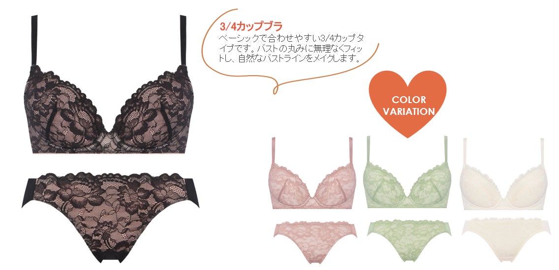 カップとレースのカラーコンビネーションが魅力的!大柄花レースで、フェミニンな気分を楽しめるシリーズです。背部はレースとパワーネットを重ねて使用し、しっかりとした安定感を実現。お好みやスタイルに合わせて選べる4色展開です。