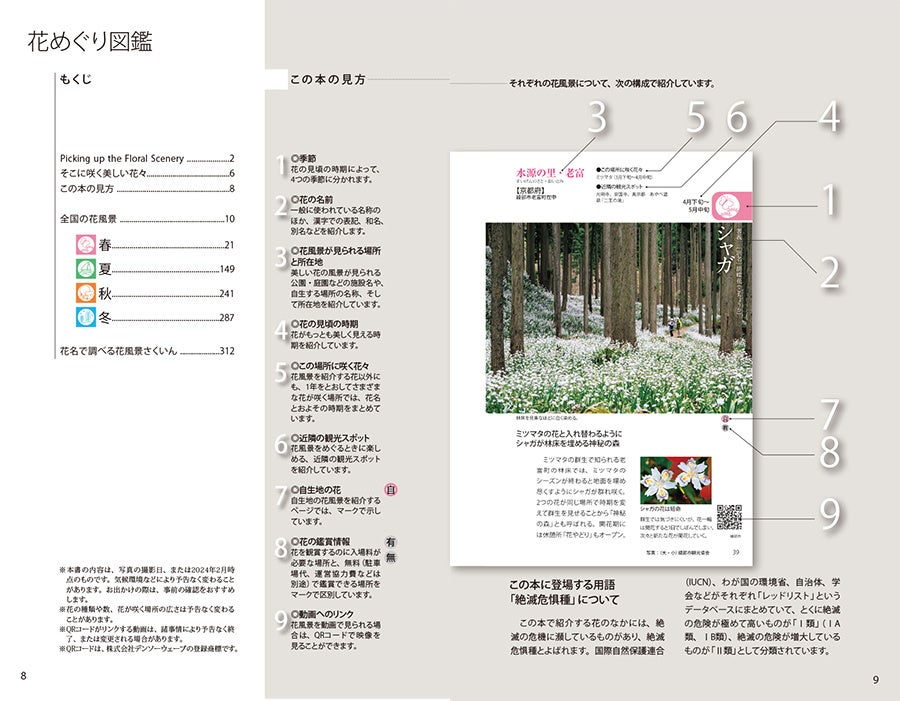 春夏秋冬ごとに章立てし、季節・都道府県・花名から探せる索引を用意。検索しやすいのもポイントです。花風景を動画で見られるQRコードも一部掲載しています。