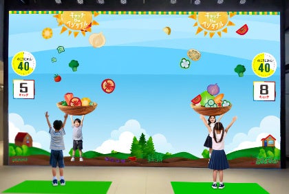 映し出された映像を見ながら、体を動かして遊ぼう!降ってくる野菜をキャッチして、デジタル上でサラダづくりが楽しめます。
