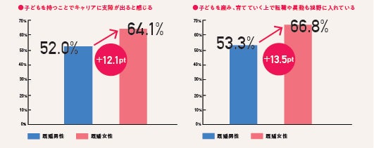 ●妊活と仕事・キャリアに対する意識に関して、既婚男女は「子どもを持つことで仕事のキャリアに支障が出る」(男性:52.0%、女性:64.1%)、「子どもを産み・育てていく上で転職や異動も視野に入れている」(男性:53.3%、女性:66.8%)と回答。男女ともに半数以上が、仕事・キャリアへの影響を感じており、特に女性は男性に比べて10pt以上高い結果に。