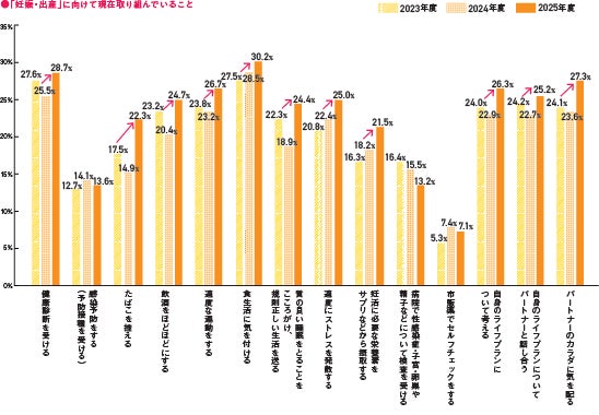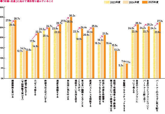 ●既婚男女に対し、「妊娠・出産に向けて現在取り組んでいること」を質問したところ、昨年からほぼ全ての項目が上昇。主に、健康的な生活習慣や、ライフプランの検討、パートナーの体に気を配ることが伸びており、妊活の取り組みは広がりを見せています。