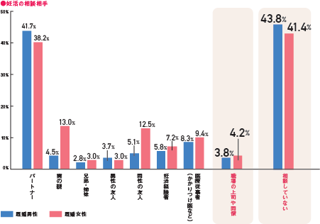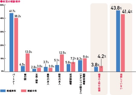 ●既婚男女の妊活の相談相手について、職場の上司・同僚への相談は、男性(3.8%)、女性(4.2%)とほとんどの方がしておらず、そもそも男女の4割以上が誰にも相談していないことが明らかになりました。