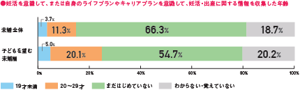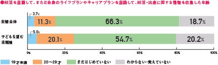 ●若年未婚男女の「妊活または自身のライフプラン・キャリアプランを意識して、『妊活・出産』の情報収集をし始めた年齢」について聞いたところ、全体では66.3%、子どもを望む層であっても54.7%と、半数以上が情報収集をまだ開始していませんでした。